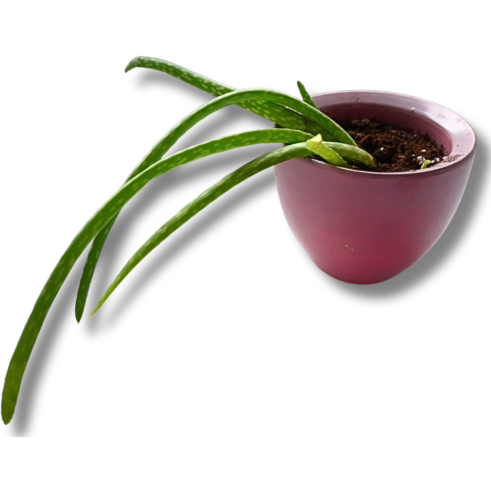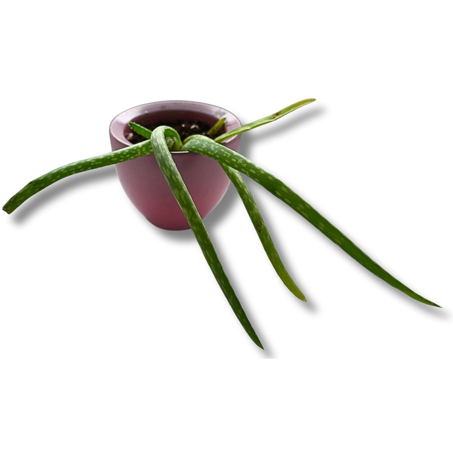 Bei dieser Pflanze handelt es sich um eine Aloe (Gattung Aloe) in einer jungen, noch nicht ausgewachsenen Form. Typisch sind die langen, schmalen, fleischigen Blätter, die aus der Mitte wachsen und sich deutlich nach außen bzw. nach unten neigen. Die Blattoberflächen zeigen helle Sprenkelungen, wie sie bei vielen Aloe-Arten in der Jugendphase üblich sind.