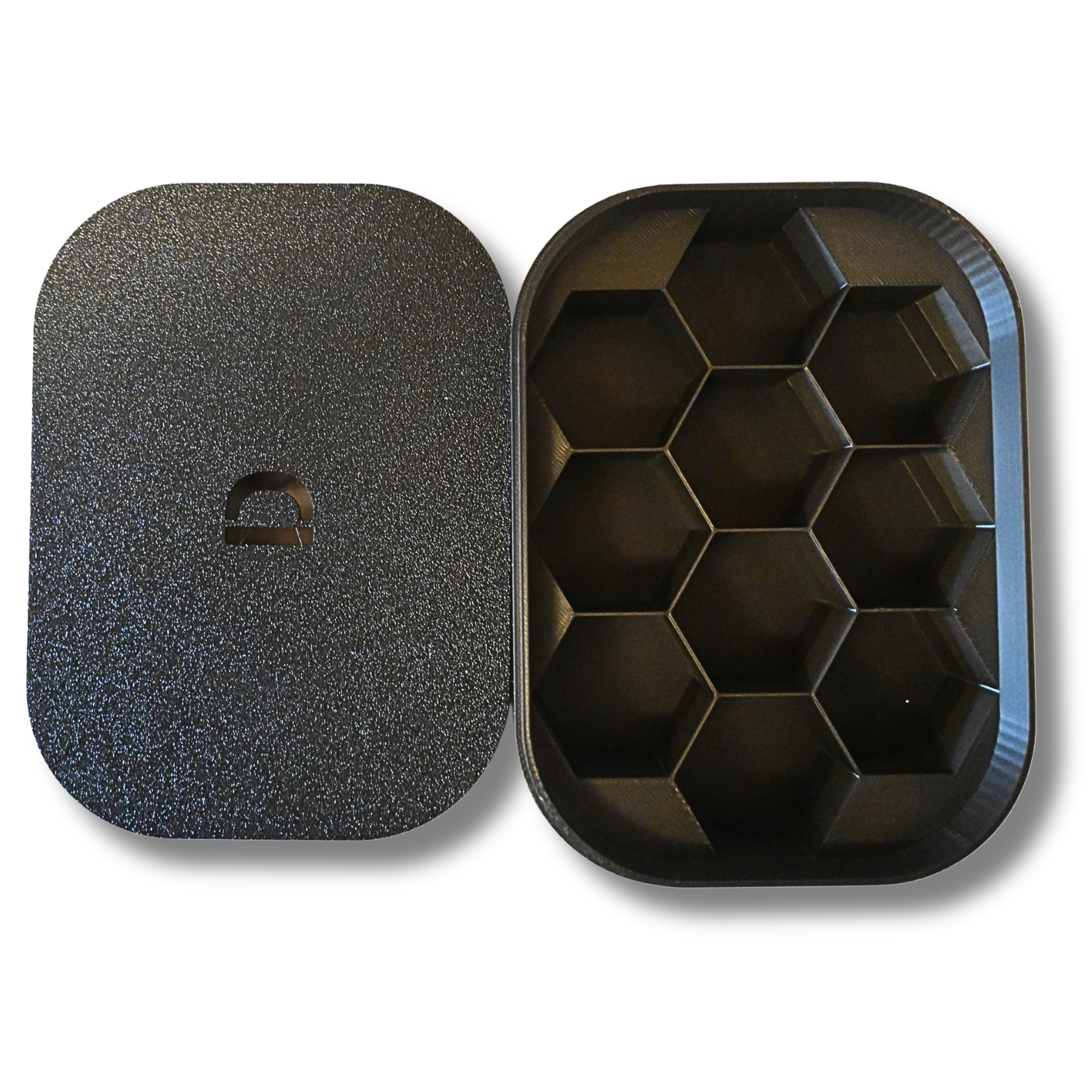 Die Aufbewahrungs Box liegt angenehm in der Hand und ist aufgrund ihrer Größe perfekt geeignet, um überall mitgeführt zu werden. In der Jackentasche, Schreibtischschublade, Schultasche oder im Auto – das kompakte Format macht die Box zum idealen täglichen Begleiter.