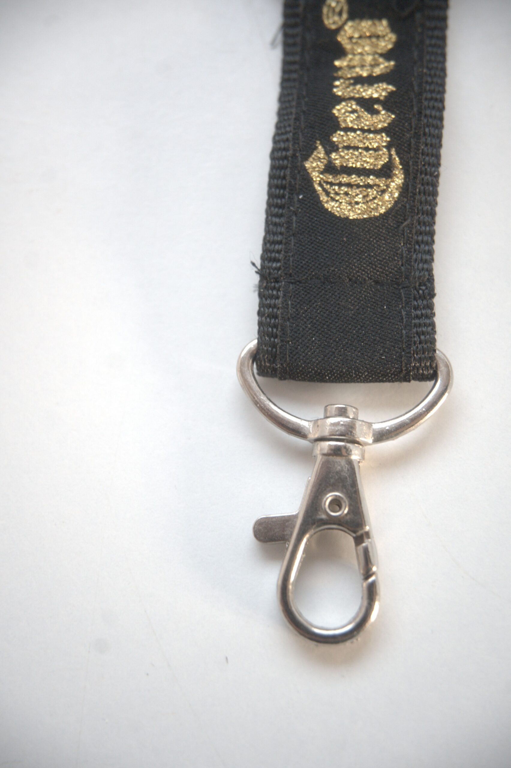 Schwarzes Schlüsselband mit goldfarbenem Cuervo-Schriftzug, stabilem Karabinerhaken und Sicherheitsverschluss – ideal für Schlüssel, Ausweise oder Taschen.