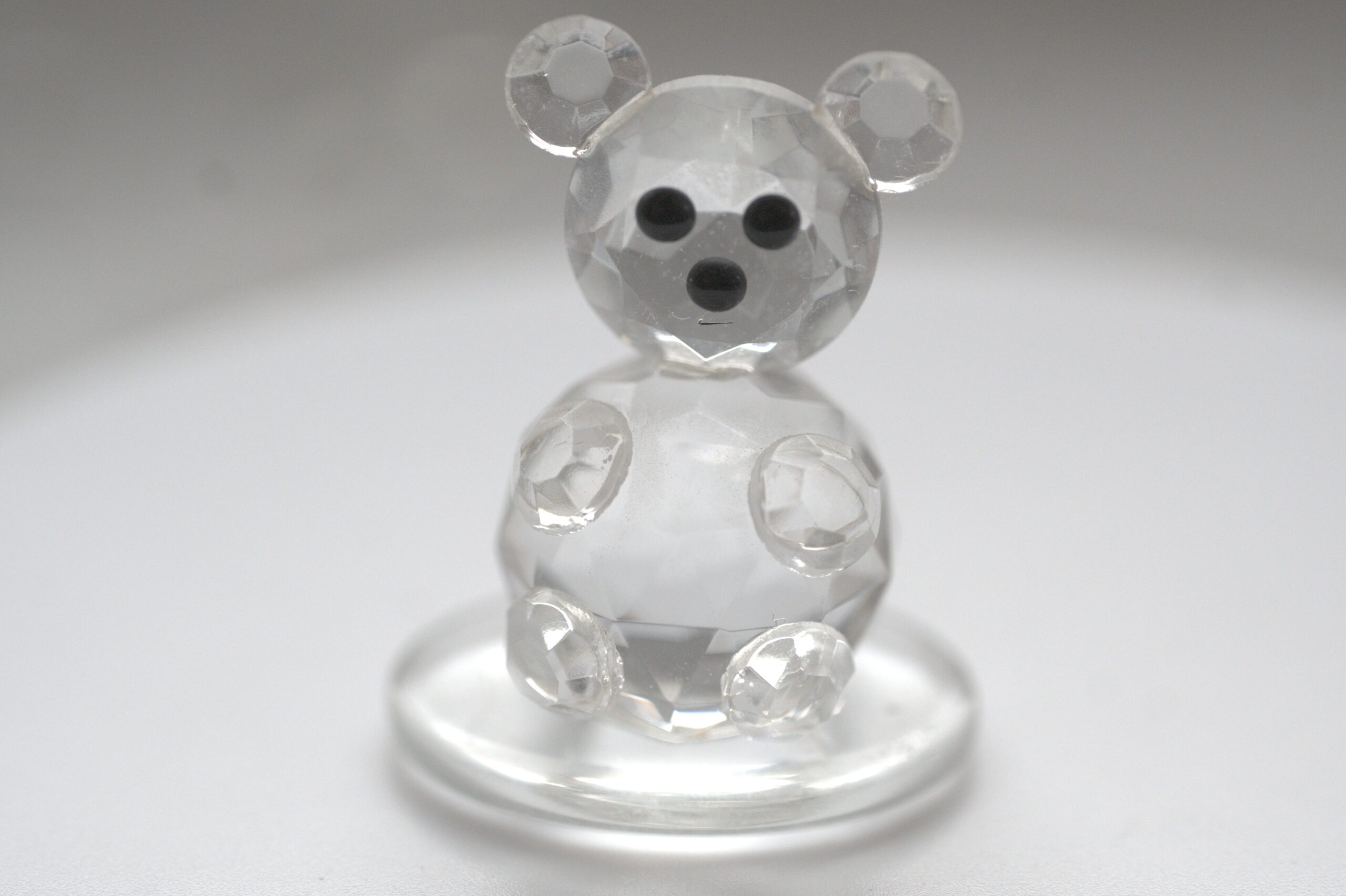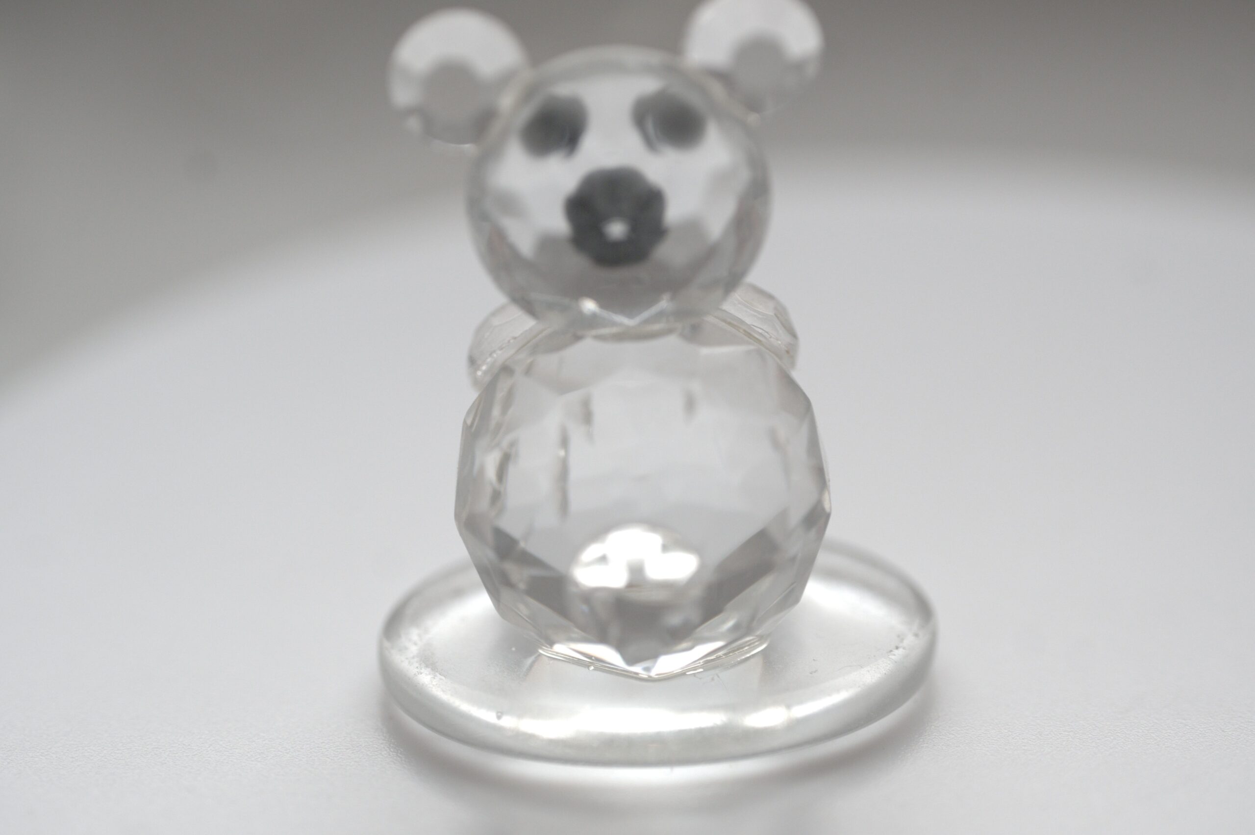 Der runde Sockel aus klarem Glas bildet eine stabile Basis und macht die Figur besonders geeignet für glatte Oberflächen wie Glasregale, Sideboards oder Fensterbänke. Gleichzeitig hebt der Sockel den Bären leicht an, wodurch sich die Lichtwirkung verstärkt und die Figur besser zur Geltung kommt – insbesondere bei Tageslicht oder indirekter Beleuchtung.