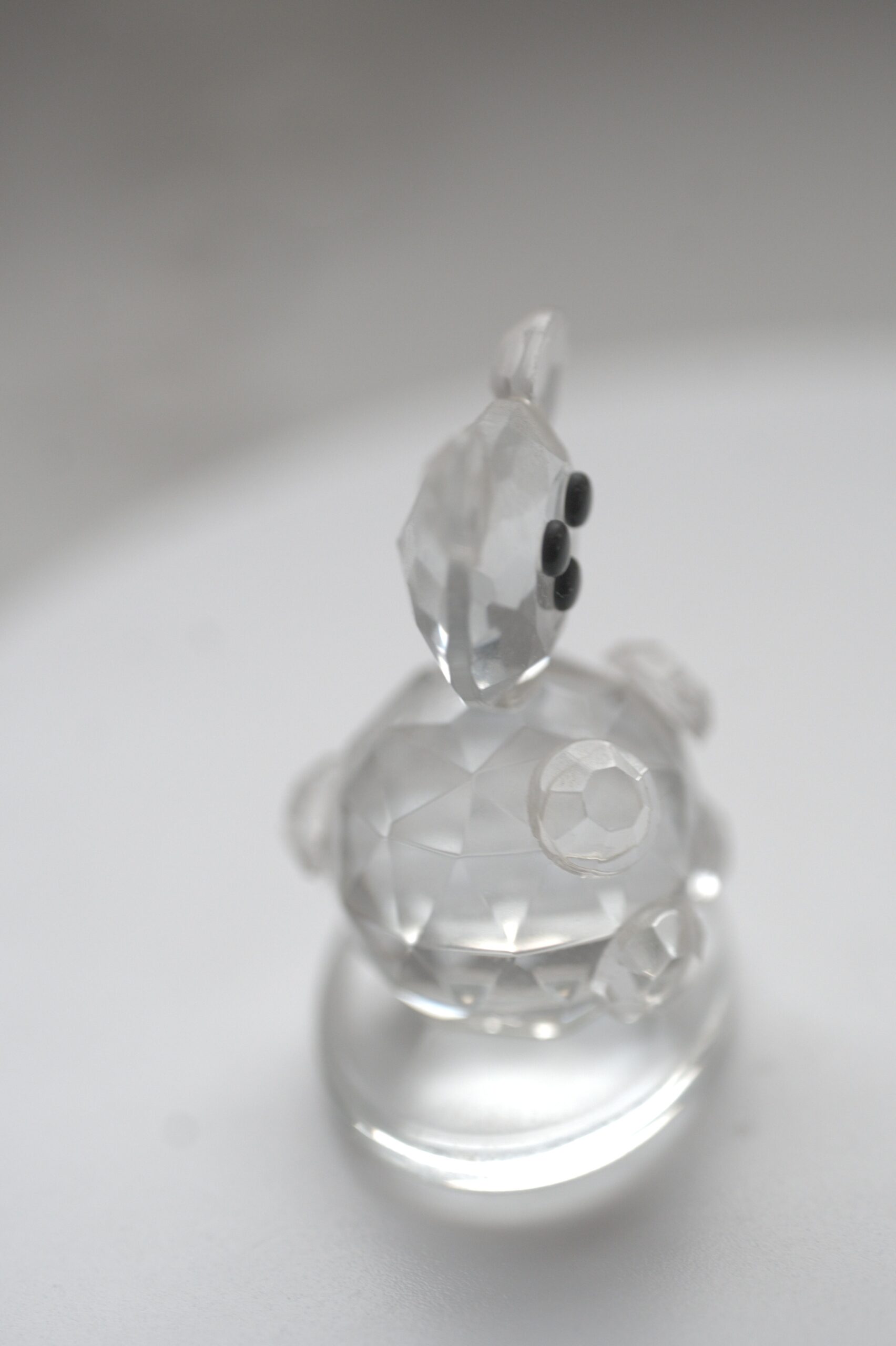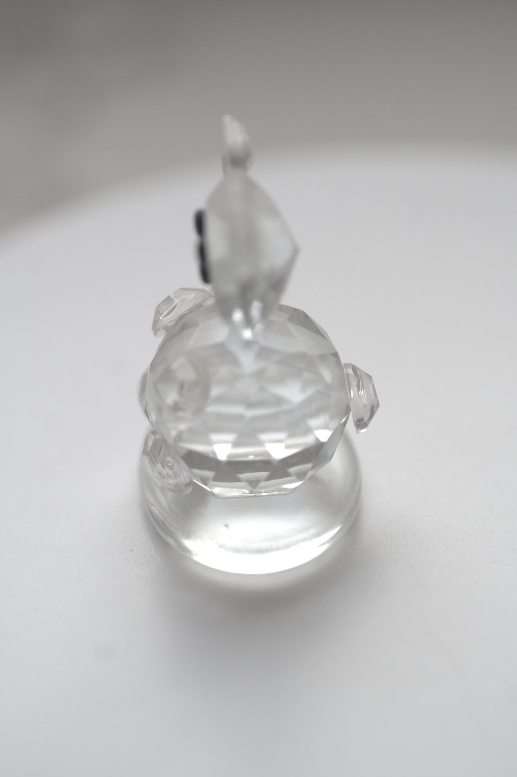 Gefertigt ist die Figur vollständig aus Glas. Die Oberfläche des Körpers weist mehrere facettierte Flächen auf, die das Licht aus unterschiedlichen Winkeln aufnehmen und sanft reflektieren. Dadurch verändert sich der Eindruck der Figur je nach Lichteinfall und Blickrichtung, ohne dabei aufdringlich zu wirken. Kopf, Ohren und Körper sind harmonisch aufeinander abgestimmt und ergeben ein stimmiges Gesamtbild.