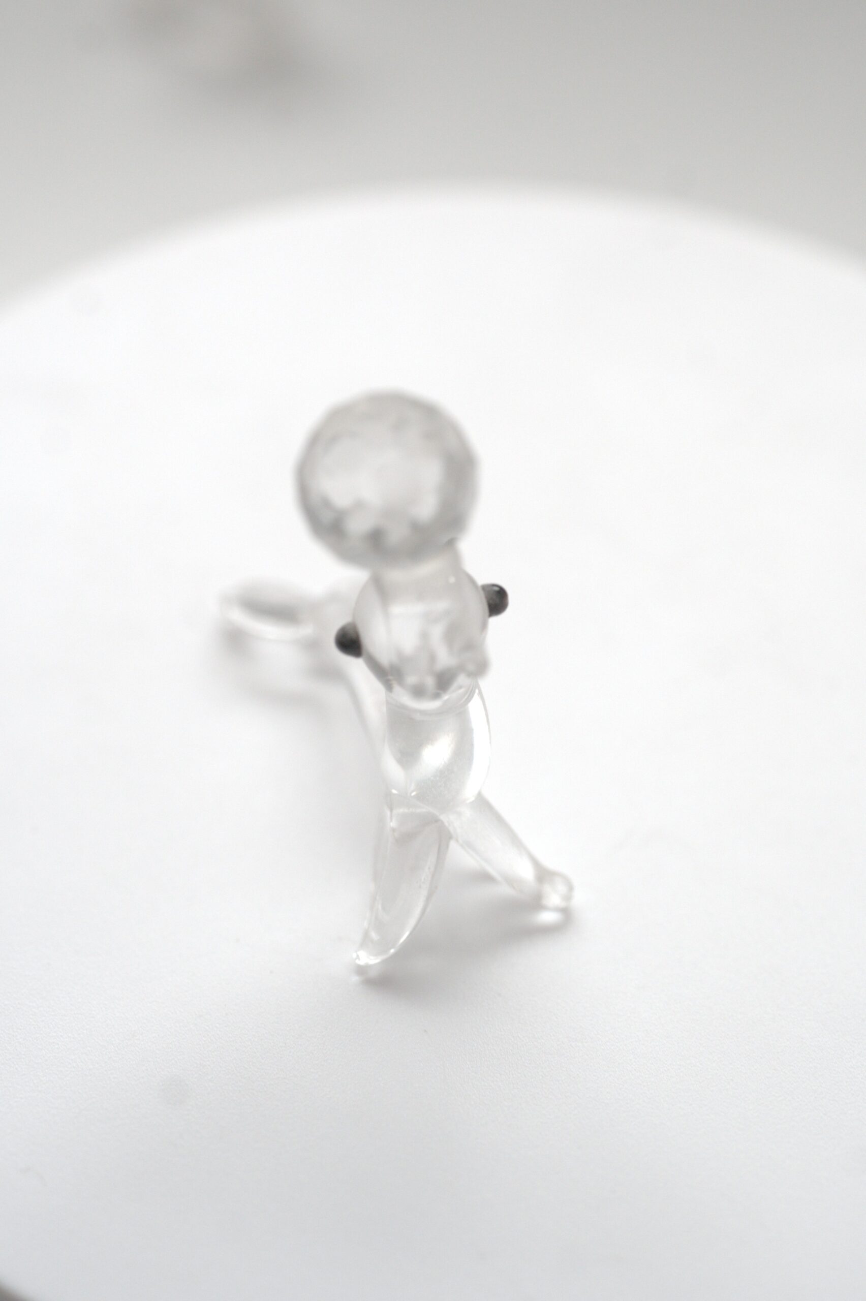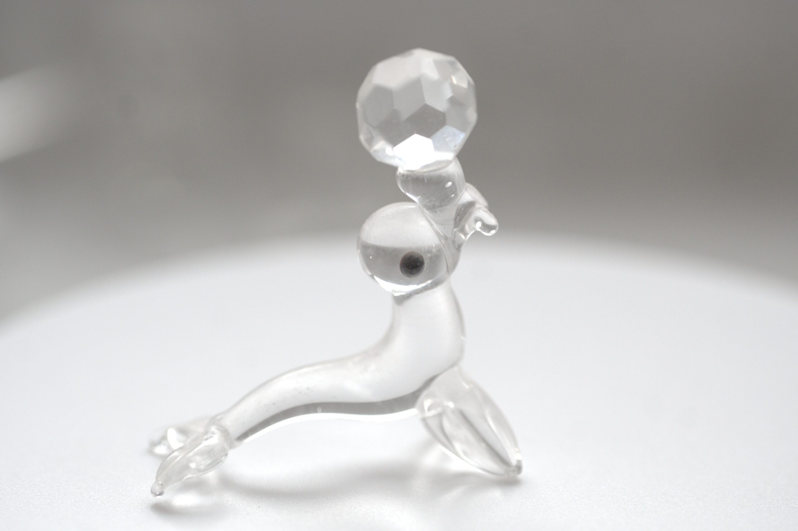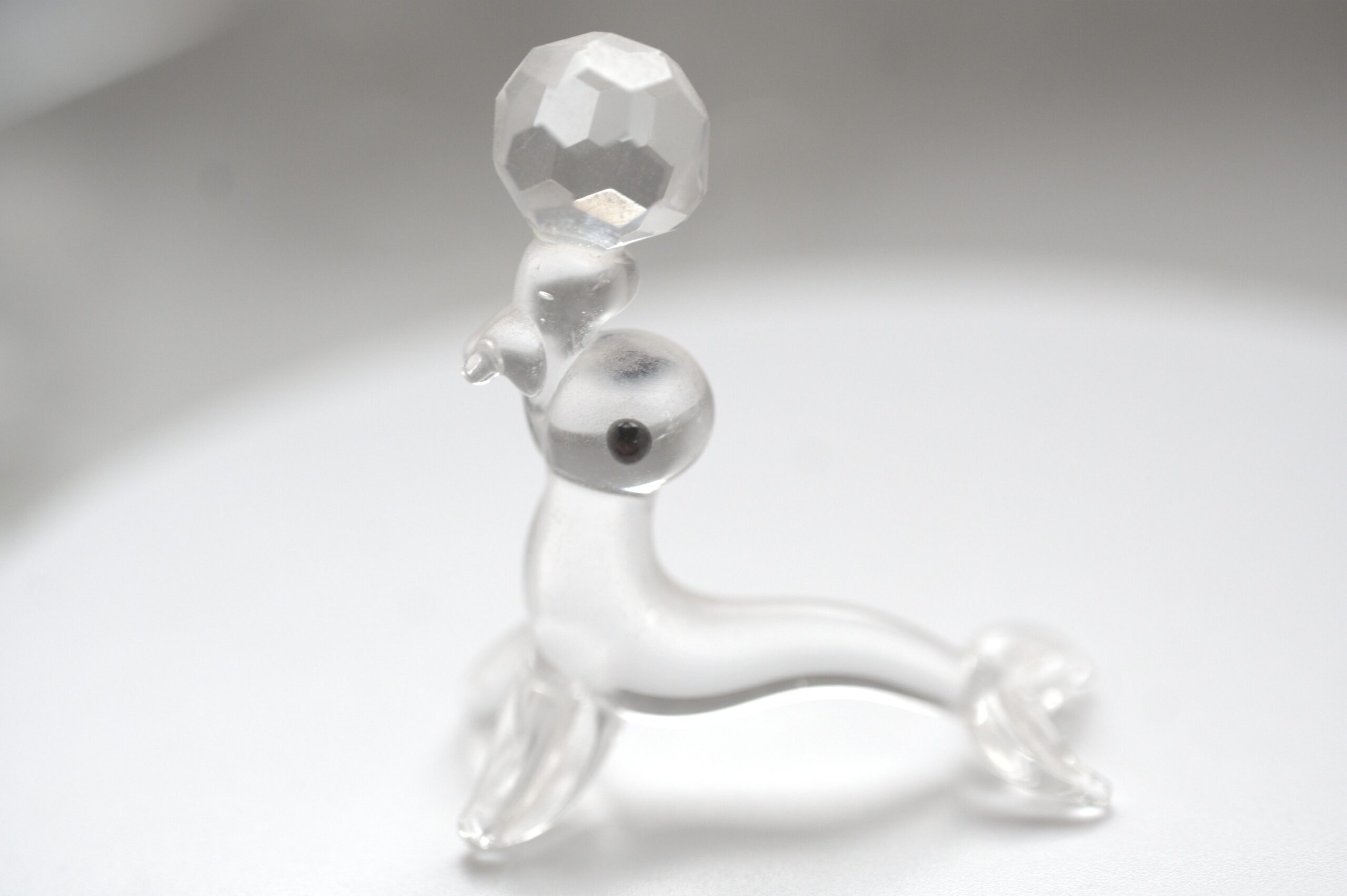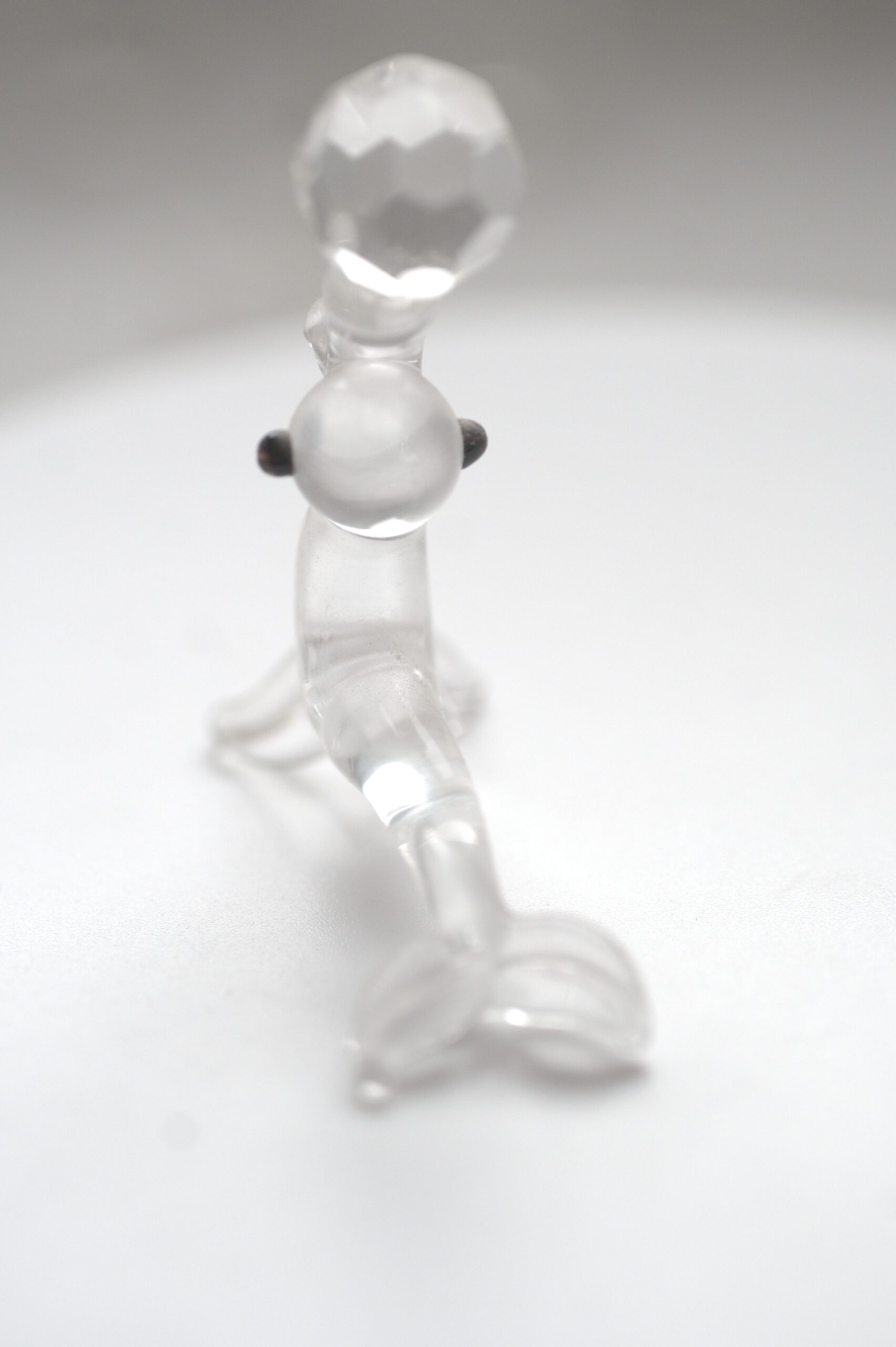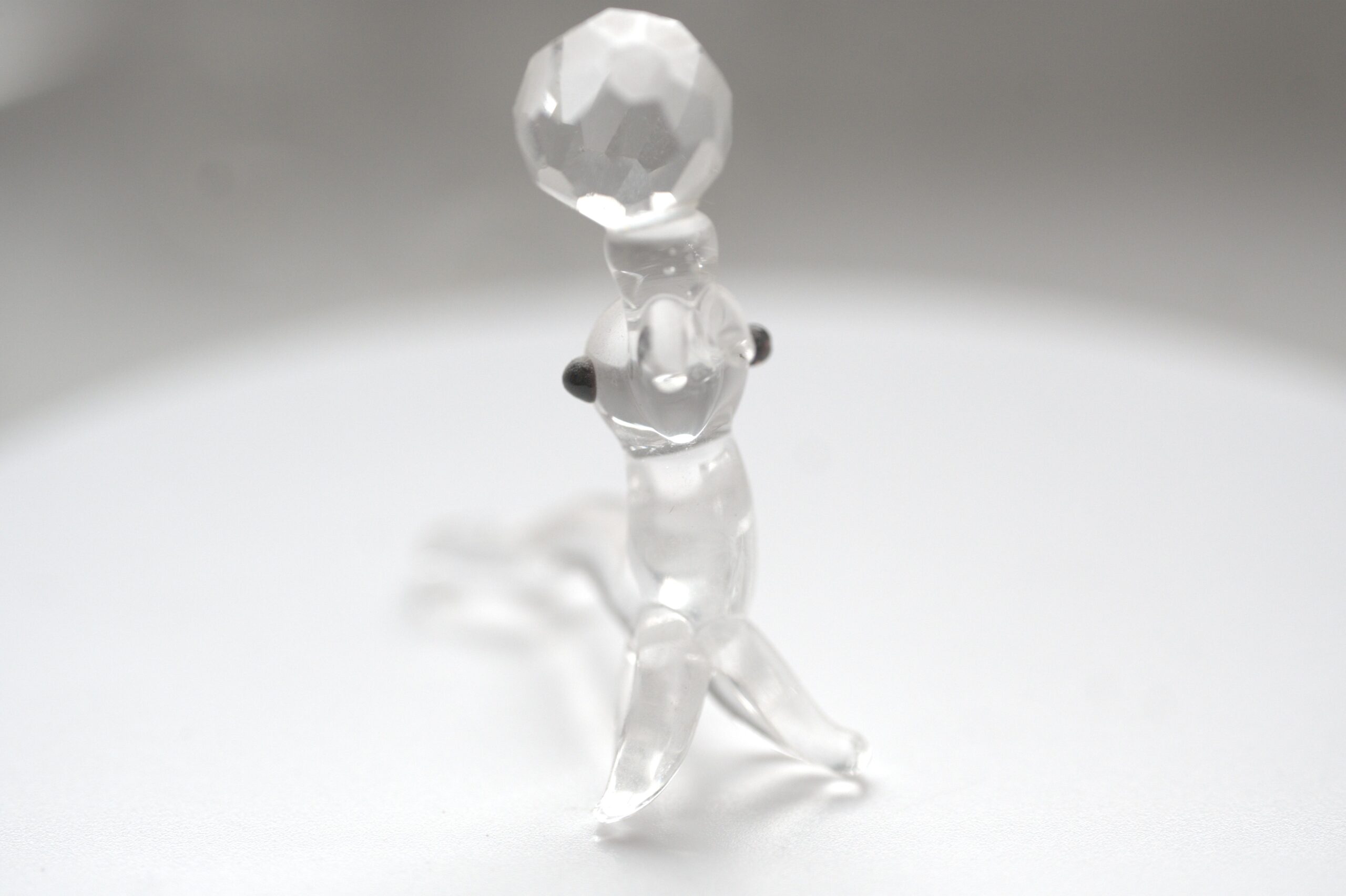Besonders auffällig ist das facettierte Glaselement im oberen Bereich, das je nach Lichteinfall schöne Reflexionen erzeugt. In Kombination mit den glatten, klaren Glasflächen entsteht ein harmonisches Zusammenspiel aus Licht, Transparenz und Form. Die Augen sind als kleine dunkle Glaseinsätze ausgeführt und setzen einen dezenten Kontrast zum ansonsten klaren Glas.