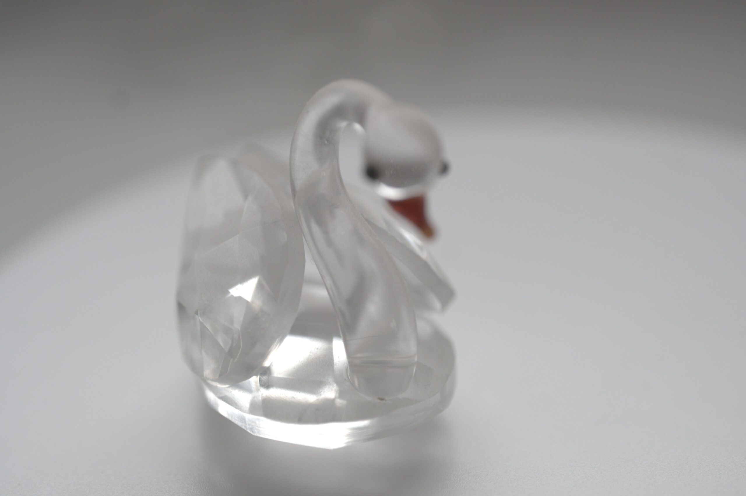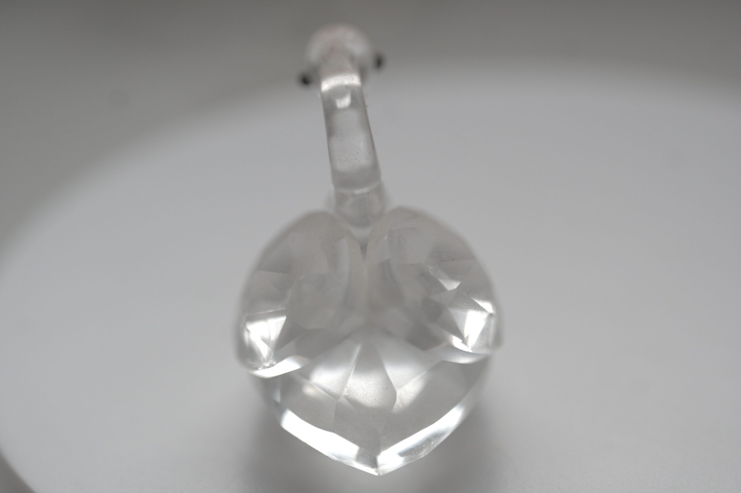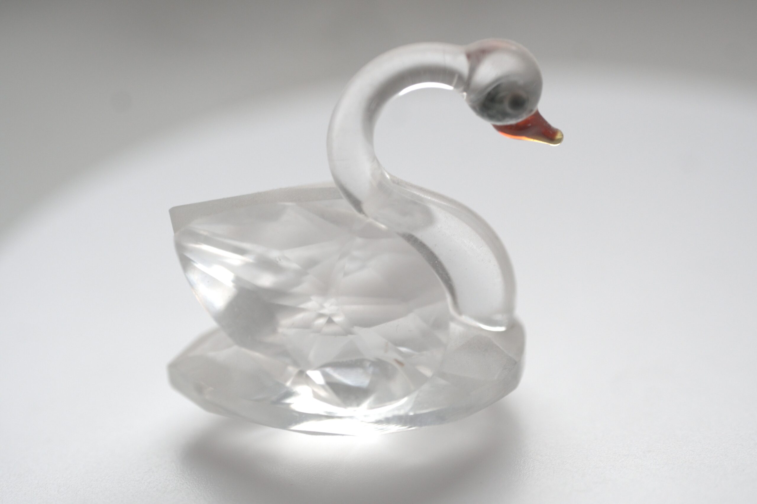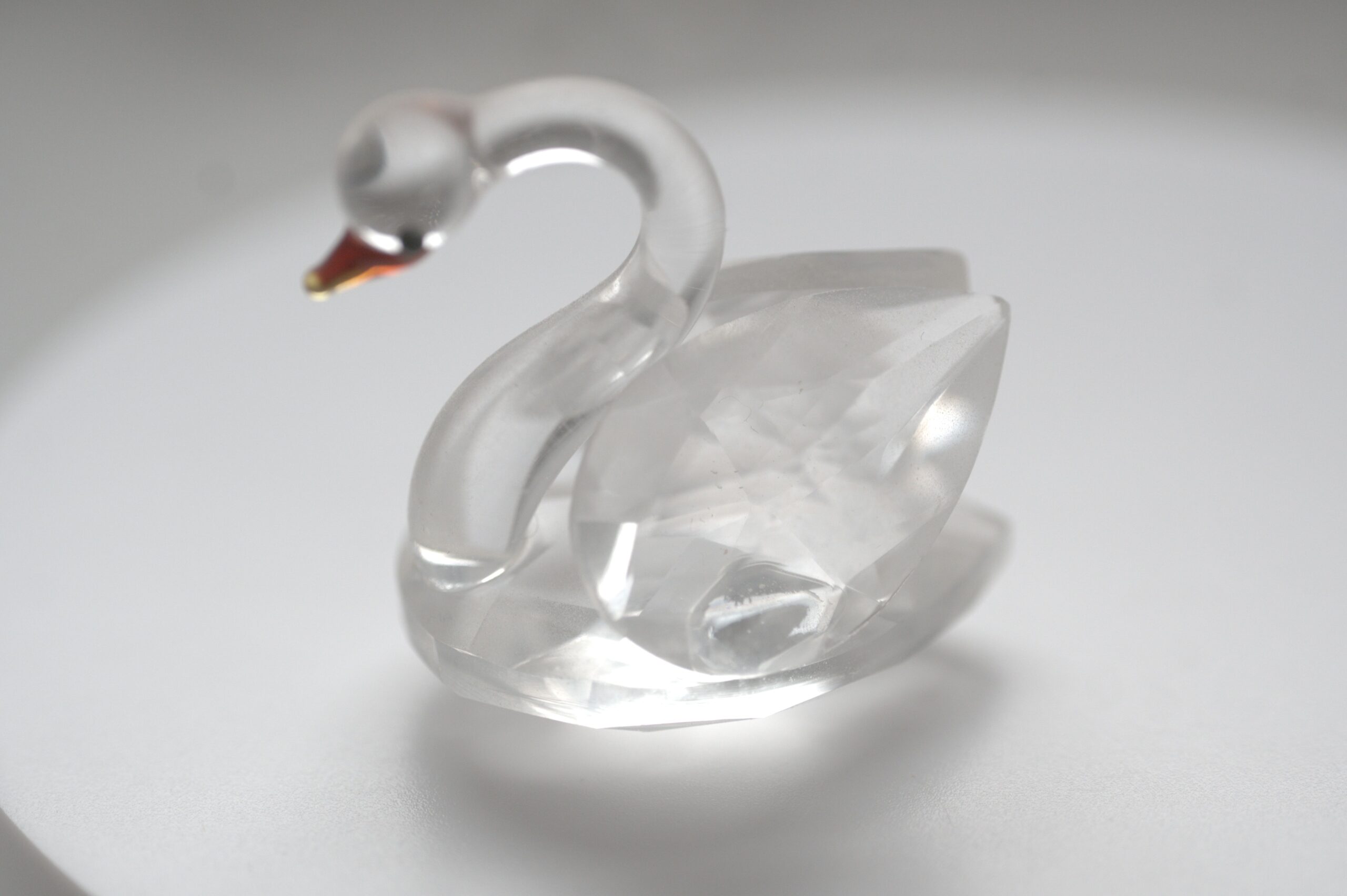 Der geschwungene Hals des Schwans ist aus Glas geformt und hebt sich optisch vom facettierten Körper ab. Diese Kombination aus glatten und geometrisch geschliffenen Flächen verleiht der Figur eine ausgewogene Spannung zwischen Klarheit und Struktur. Der Körper ruht stabil auf einer flach ausgearbeiteten Standfläche, sodass sich die Figur sicher platzieren lässt – sei es auf einer Fensterbank, einem Sideboard, einem Regal oder in einer Vitrine.