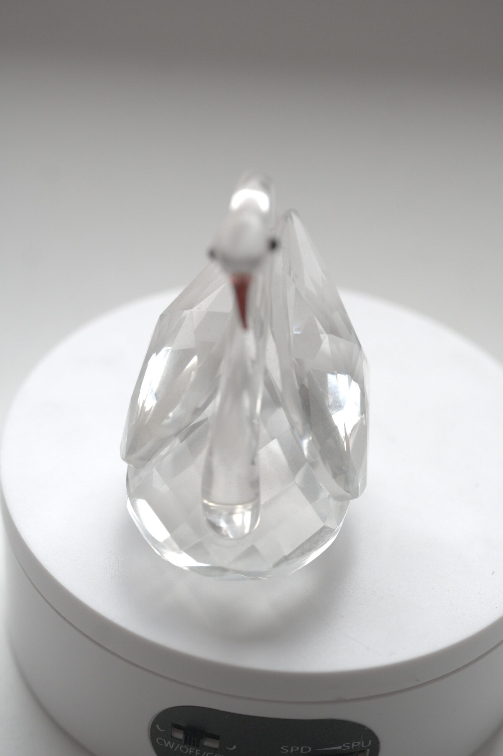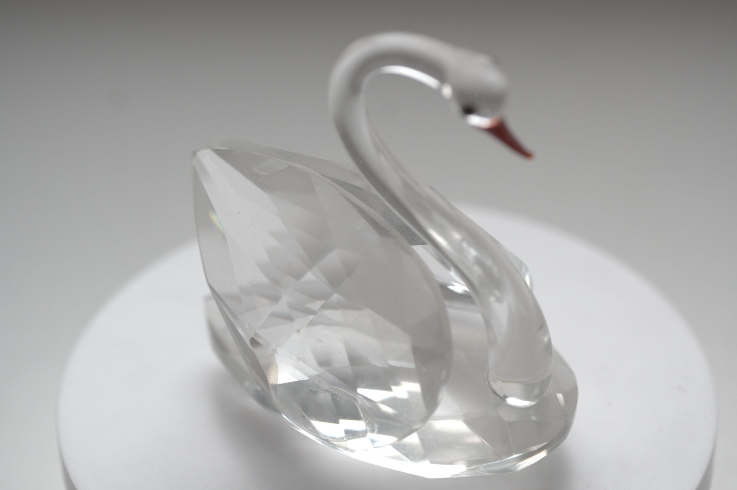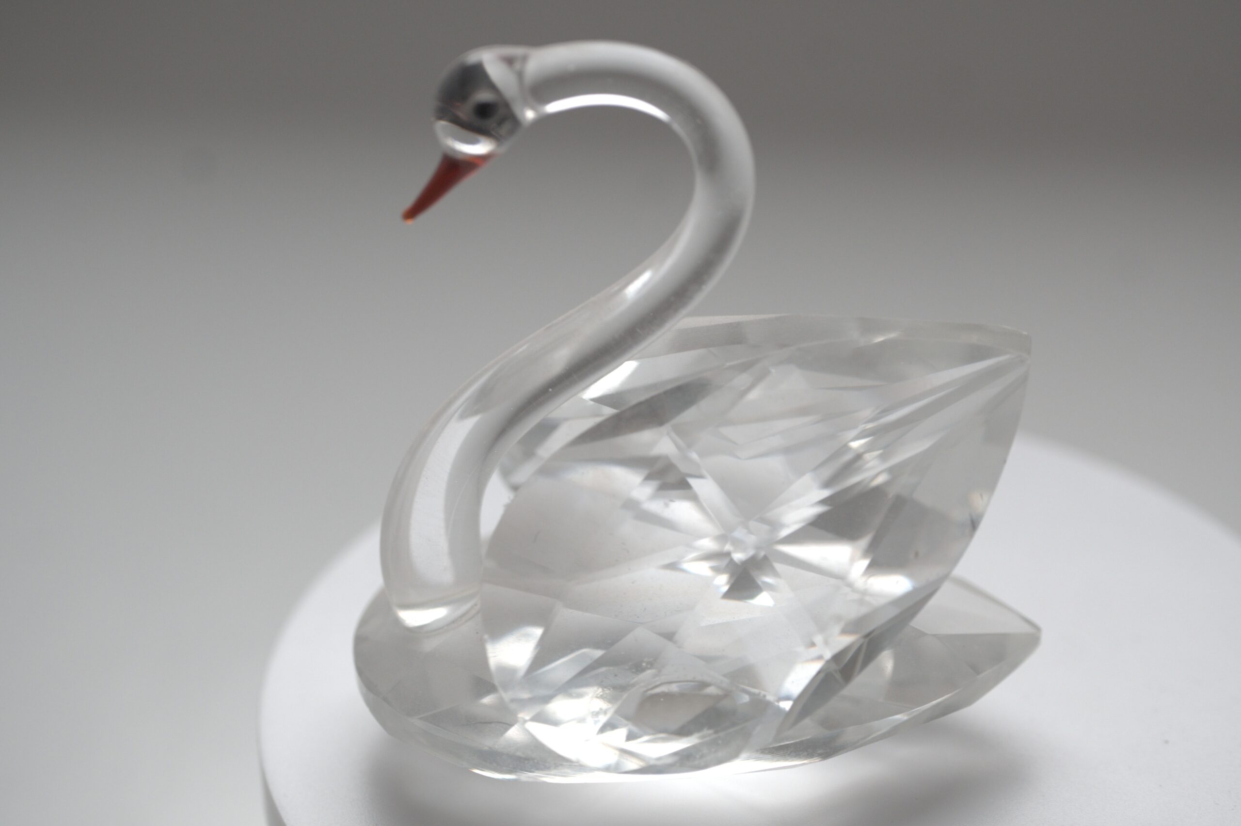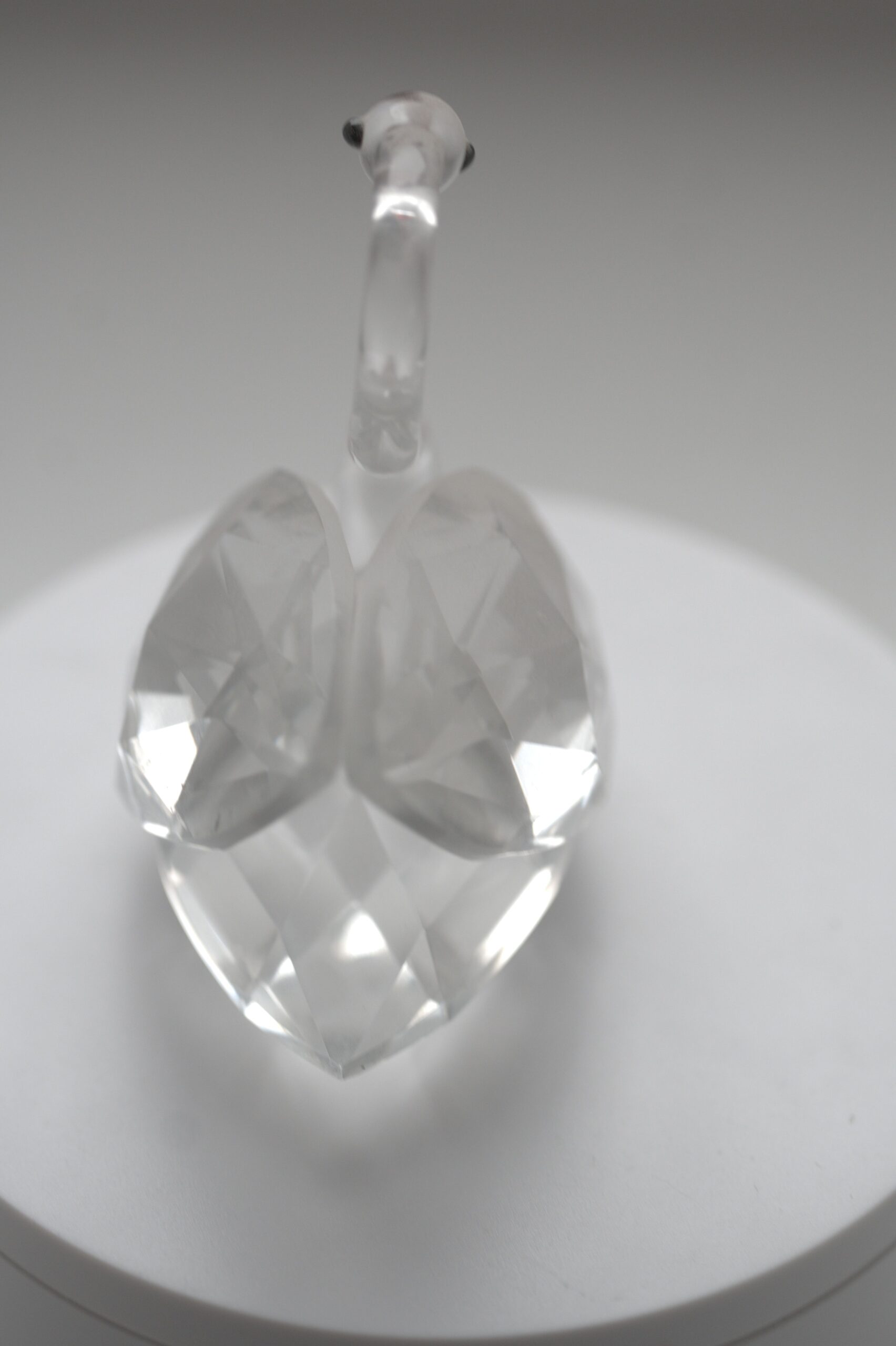 Diese dekorative Glasfigur stellt einen Schwan dar und zeichnet sich durch ihre klare, elegante Formgebung aus. Der Körper des Schwans ist aus transparentem Glas gefertigt, wobei die Flügel und der Rumpf facettiert gearbeitet sind. Durch diese Facettierung entstehen lebendige Lichtreflexionen, die je nach Lichteinfall unterschiedlich wirken und der Figur eine besondere Tiefe verleihen.