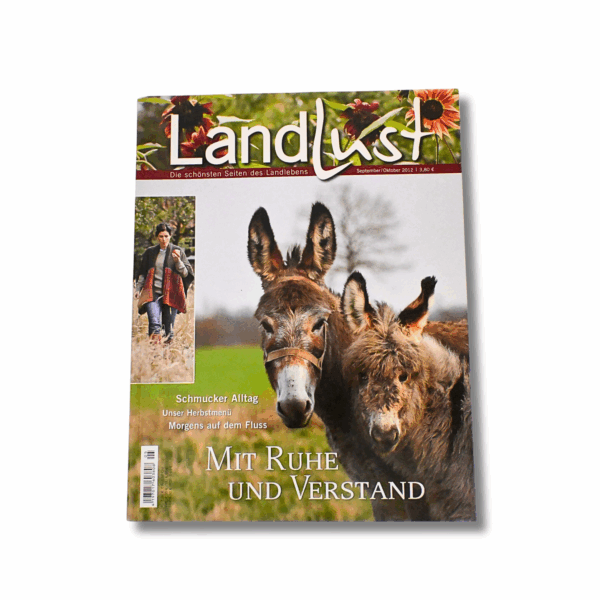 Themen dieser Ausgabe sind unter anderem: Schmucker Alltag (Ideen für den ländlichen Lebensstil), Unser Herbstmenü (rezepte mit saisonalen Zutaten), sowie Morgens auf dem Fluss (Naturerlebnisse und Tierbeobachtungen am Wasser). Die Titelgeschichte Mit Ruhe und Verstand porträtiert Esel als ruhige Begleiter des Landlebens – genügsam, freundlich und charakterstark. Landlust: Sept/Okt 2012 | Mit Ruhe und Verstand | Garten | Tiere | Landleben