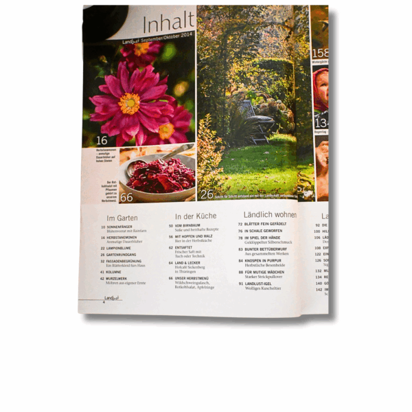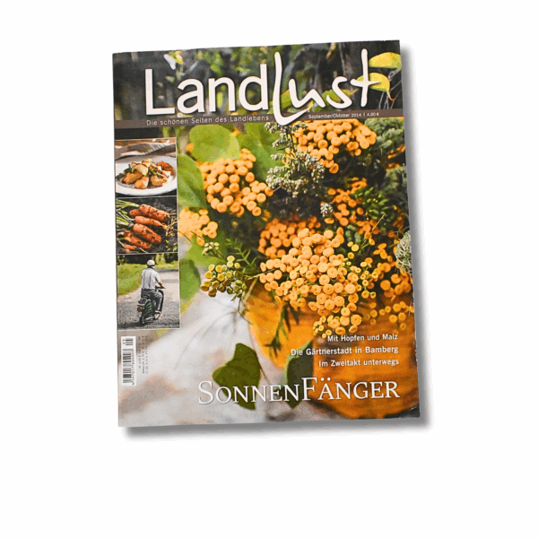 Die Ausgabe Landlust – September/Oktober 2014 steht unter dem Motto Sonnenfänger und widmet sich den goldenen Seiten des Spätsommers und Herbstes. Mit beeindruckender Fotografie, lebendigen Reportagen und praktischen Tipps lädt das Magazin dazu ein, die Jahreszeit bewusst zu genießen.