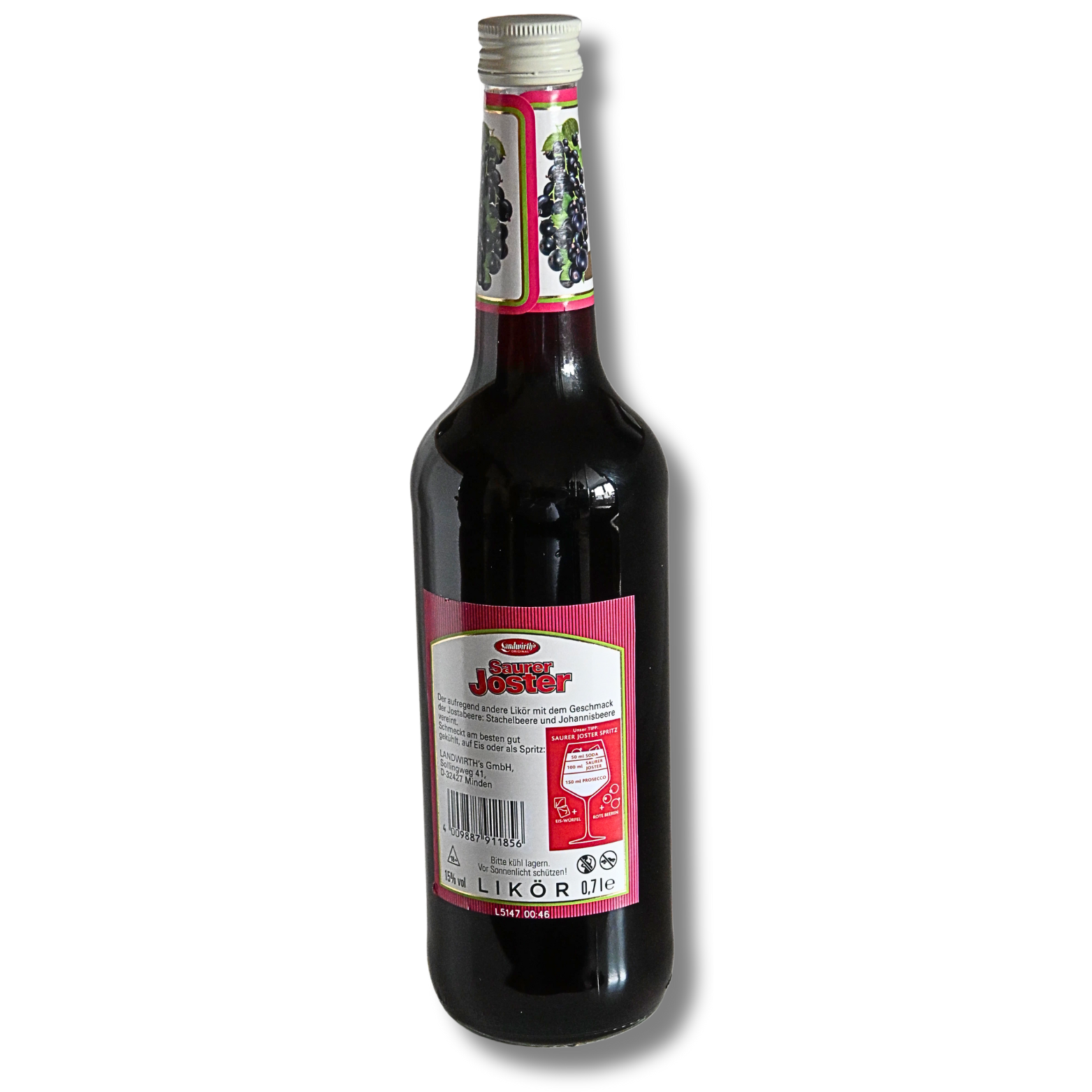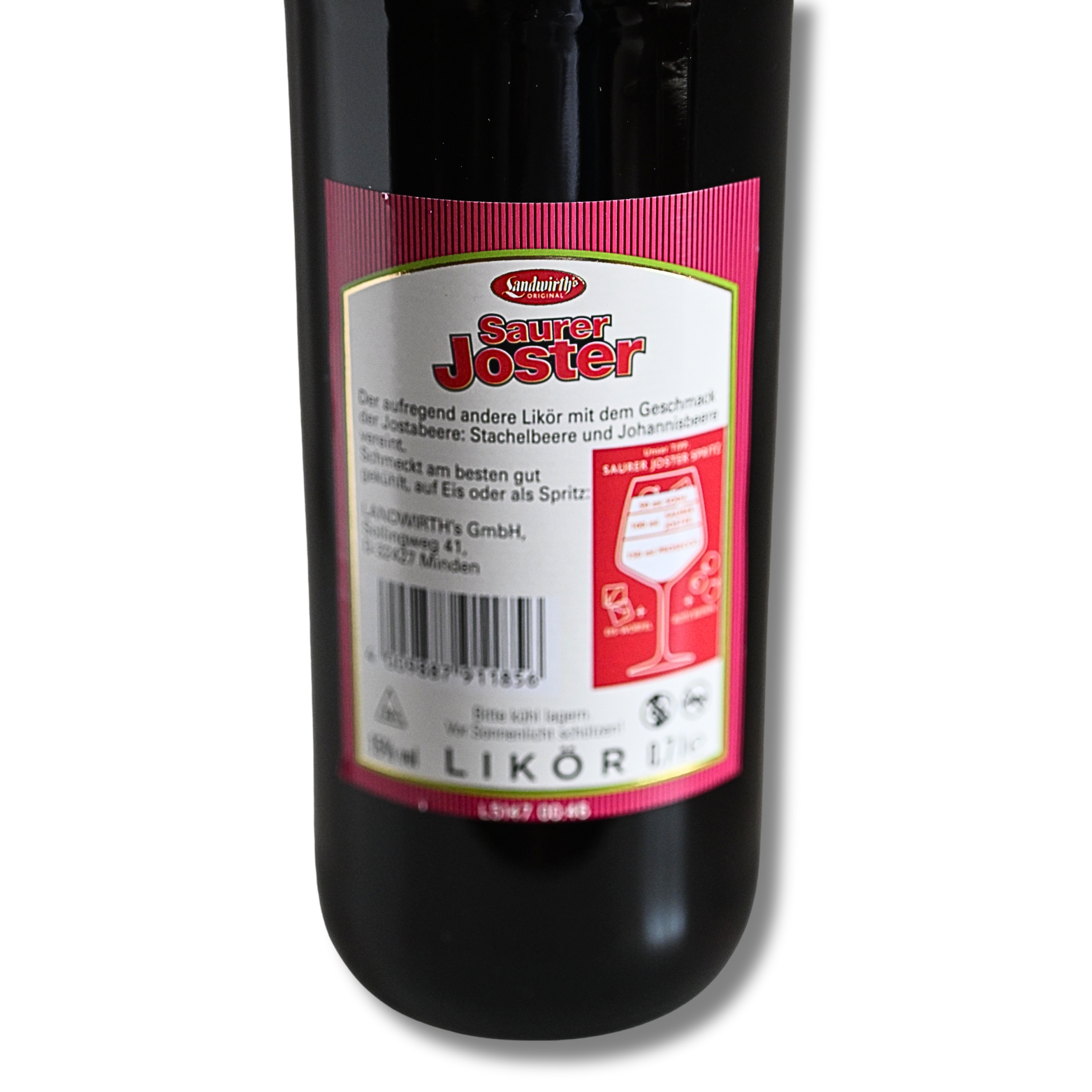 Landwirth Saurer Joster Beerenlikör. Berentzen Brennerei. Fruchtlikör aus Jostabeeren. Wird mit einem Schuss edlem Wodka zum Sauren Joster. Abgefüllt in 0,7 Liter Flaschen mit 15% Vol.