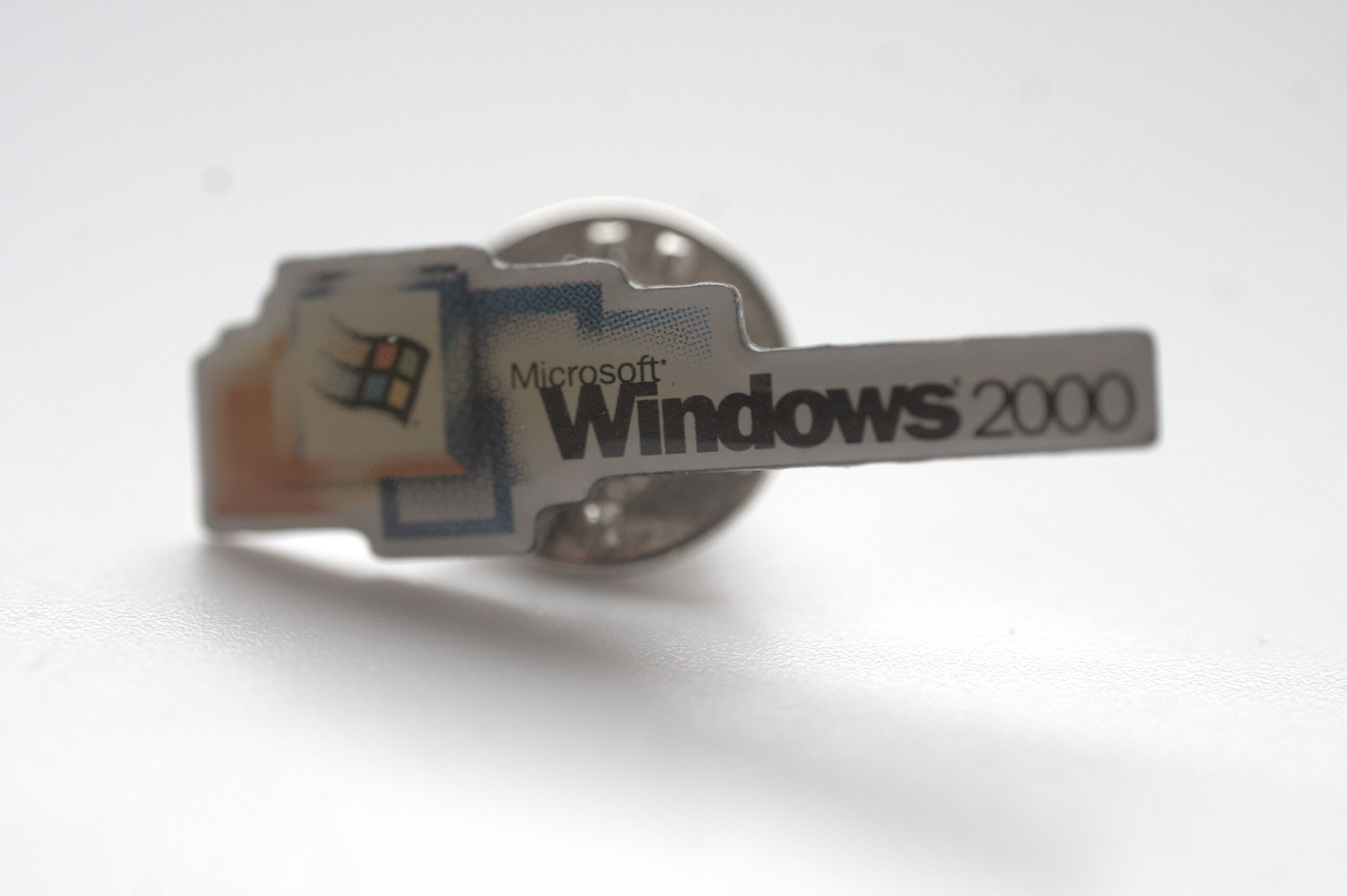 Originaler Microsoft Windows 2000 Pin, vermutlich als Werbe- oder Promotion-Anstecker zur Einführung des Betriebssystems um das Jahr 2000. Der Pin zeigt das klassische Windows-Logo mit der Aufschrift „Windows 2000“ und ist ein typisches Sammlerstück aus der frühen PC- und IT-Geschichte.