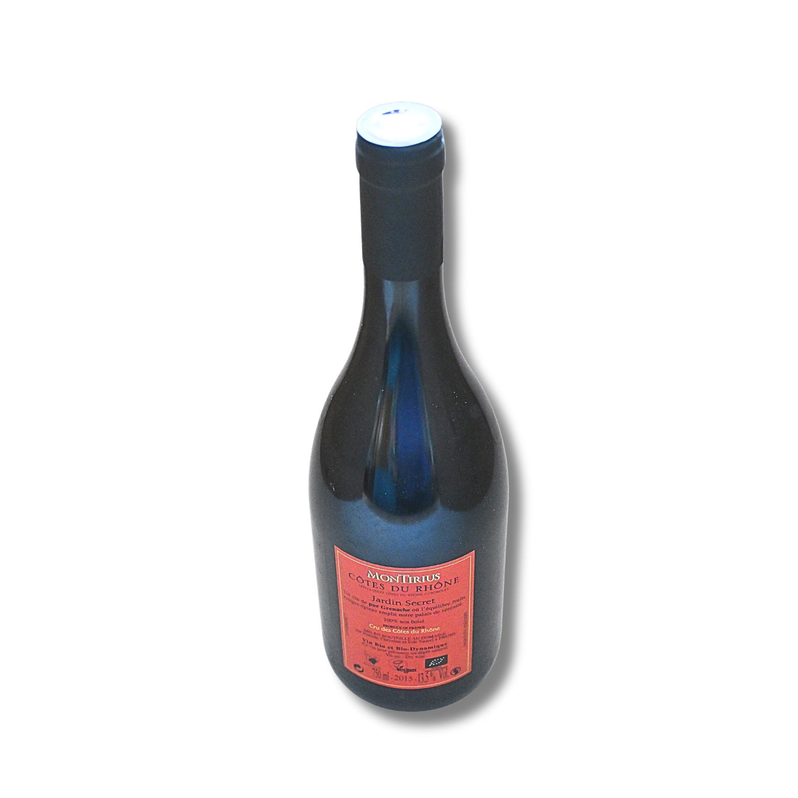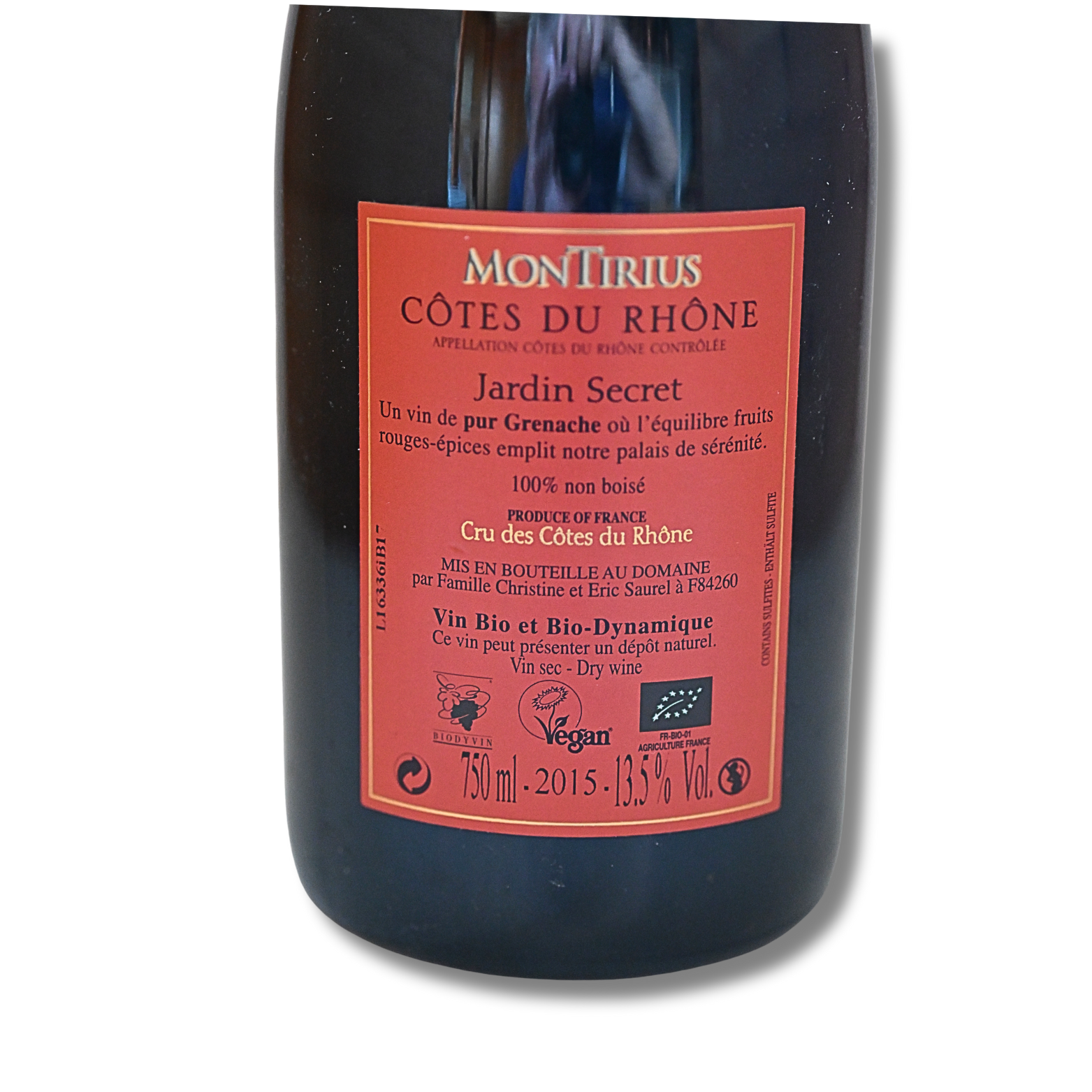 Montirius Jardin Secret AOC Cotes du Rhone Rouge Bio 2015, Rotwein-trocken, Bioweingut Frankreich, Rebsorte Grenache. Lagerung: 5 – 7 Jahre. Abgefüllt in 0,75 Liter Flaschen und 13,5 % Vol.
