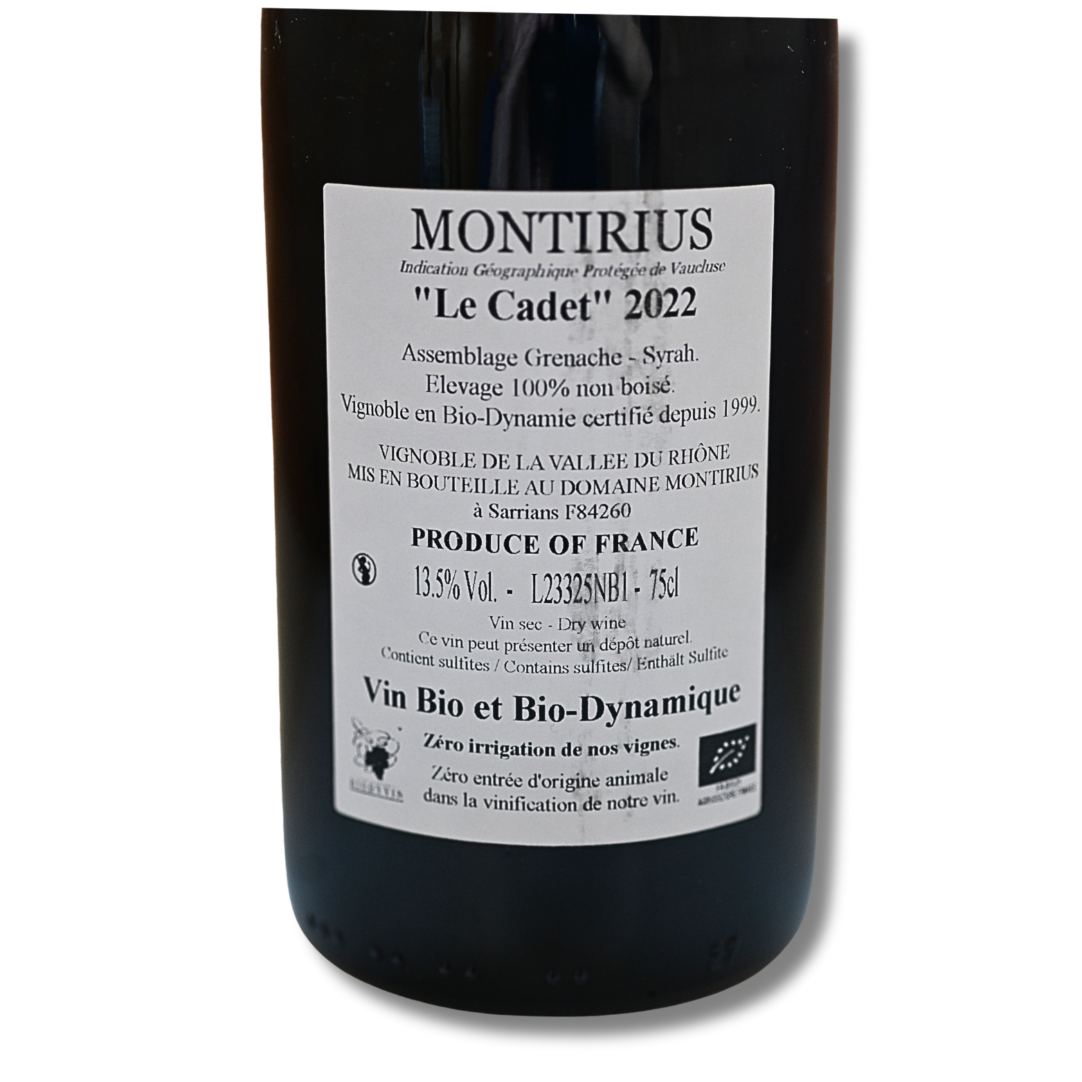IGP Vaucluse Montirius Le Cadet Red 2022, Rotwein-trocken, Bioweingut Frankreich, Rebsorte: 50 % Grenache, 50 % Syrah. Lagerung: 8 – 15 Jahre.