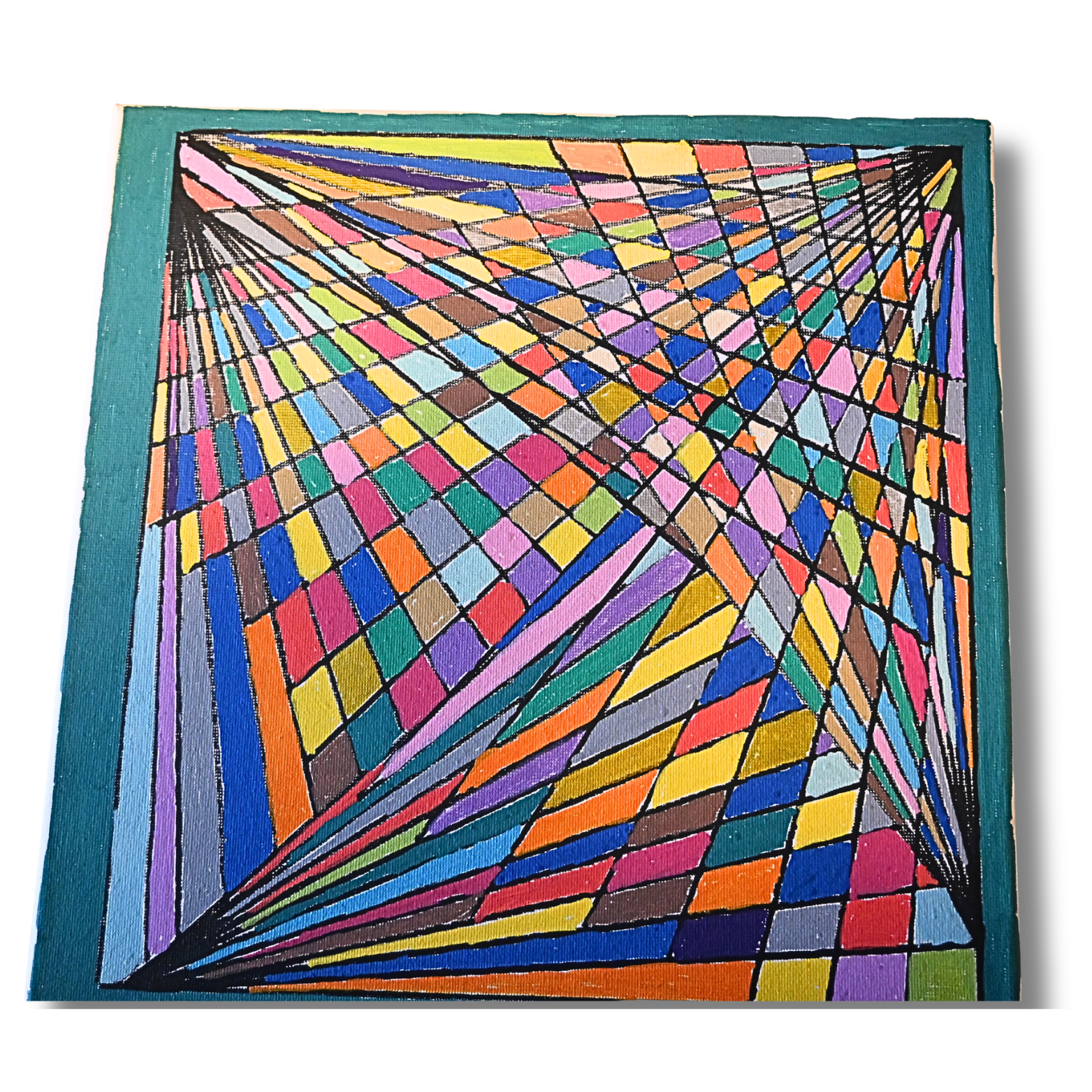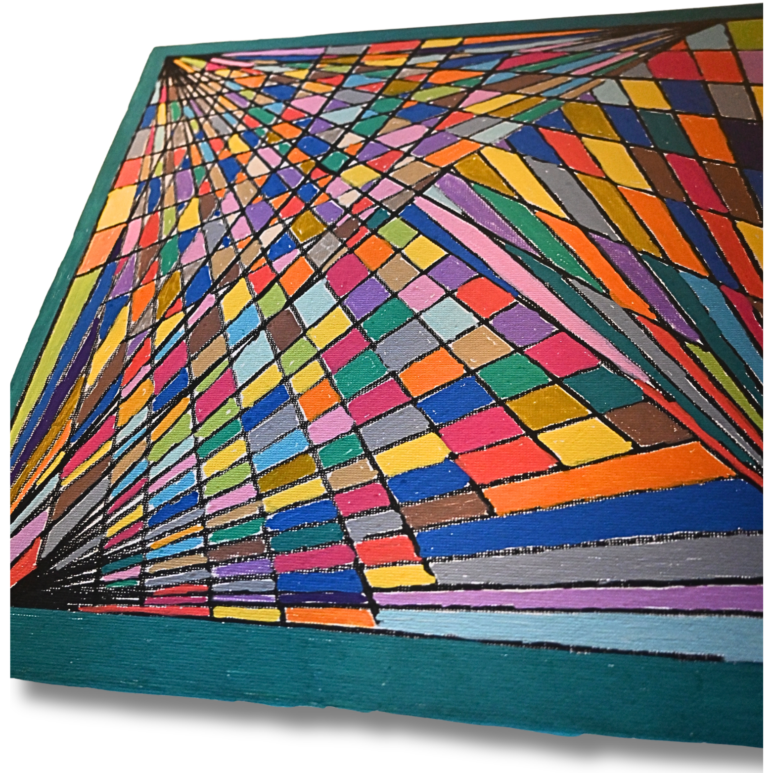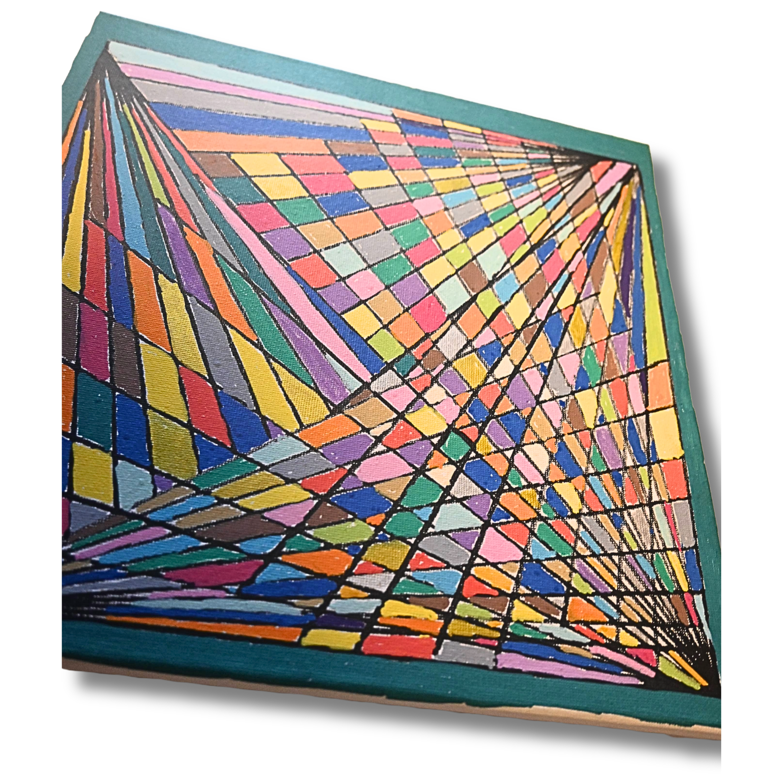 Die Vielzahl an Farben in Kombination mit der geometrischen Anordnung schafft ein spannendes Gesamtbild, das je nach Betrachtungswinkel unterschiedliche Eindrücke vermittelt. Dadurch entsteht ein fast dreidimensionaler Effekt.