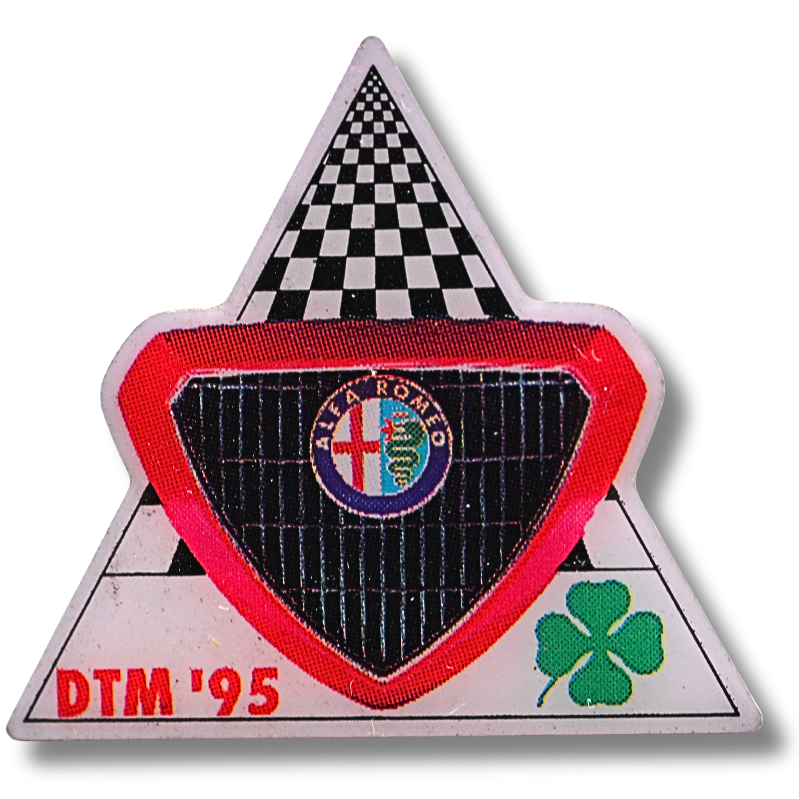 Originaler Motorsport-Pin mit Alfa-Romeo-Motiv zur DTM-Saison 1995. Markantes Dreiecksdesign mit Zielflaggen-Optik, Alfa-Romeo-Logo und Kleeblatt-Symbol – ein klassisches Sammlerstück für Motorsport- und Alfa-Romeo-Fans.
