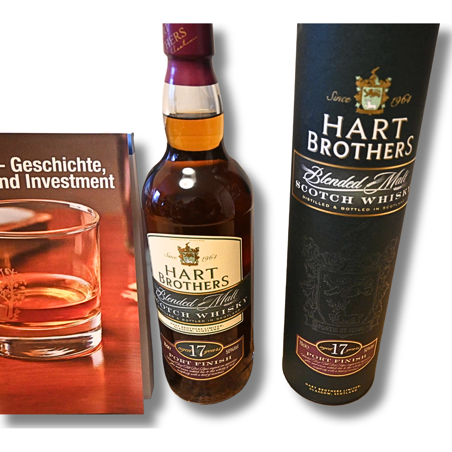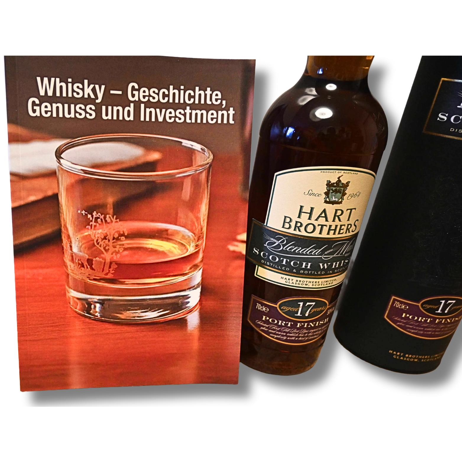Das Set beinhaltet eine 0,7 Liter Flasche Hart Brothers 17 Jahre Single Malt Scotch & ein Whisky Buch.