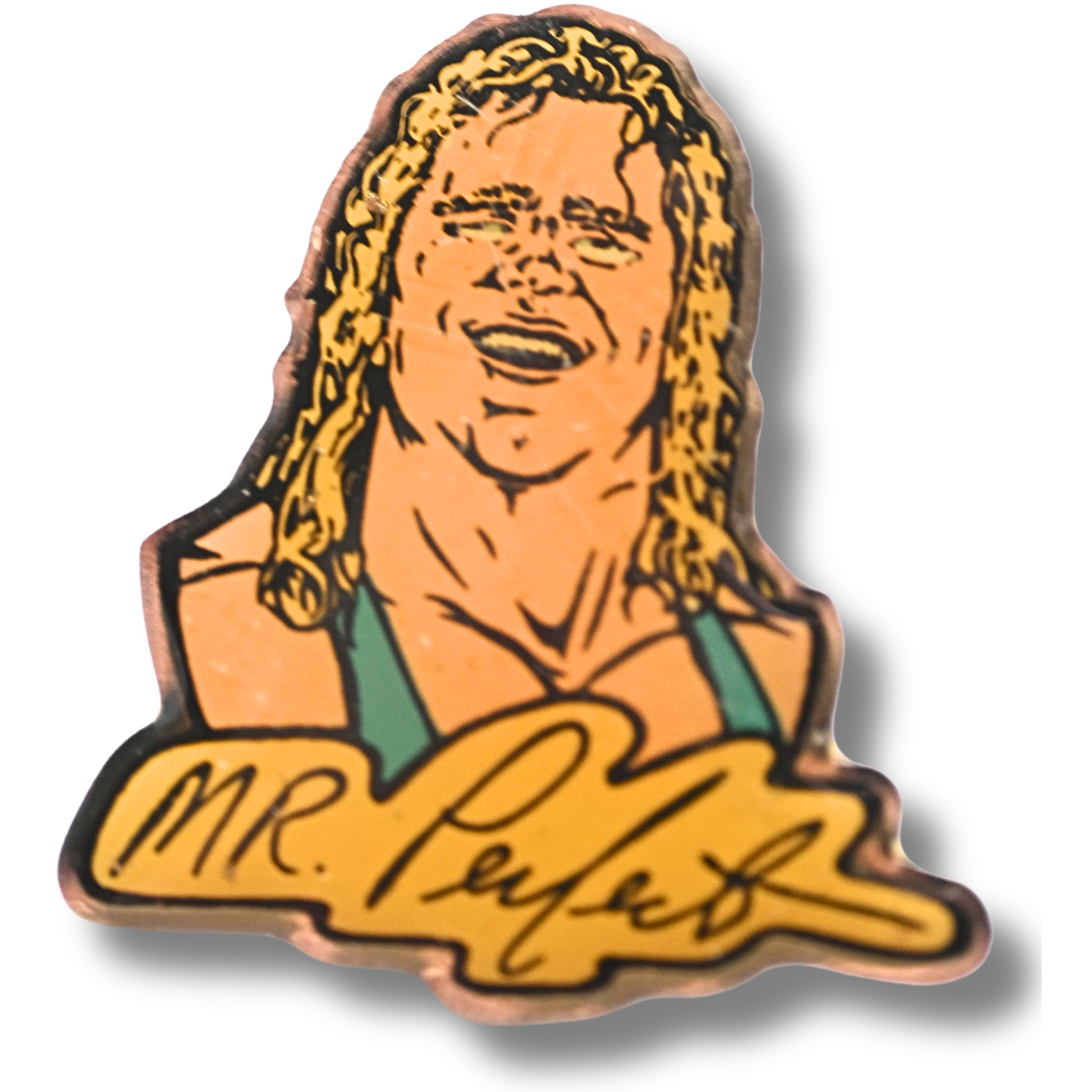 Dieser originale WWF Wrestling Pin „Mr. Perfect“ zeigt eines der bekanntesten Portraitmotive des legendären Wrestlers Curt Hennig. Das Design kombiniert das charakteristische Konterfei mit dem Schriftzug „Mr. Perfect“ und steht exemplarisch für die Wrestling-Ära der frühen 1990er-Jahre.