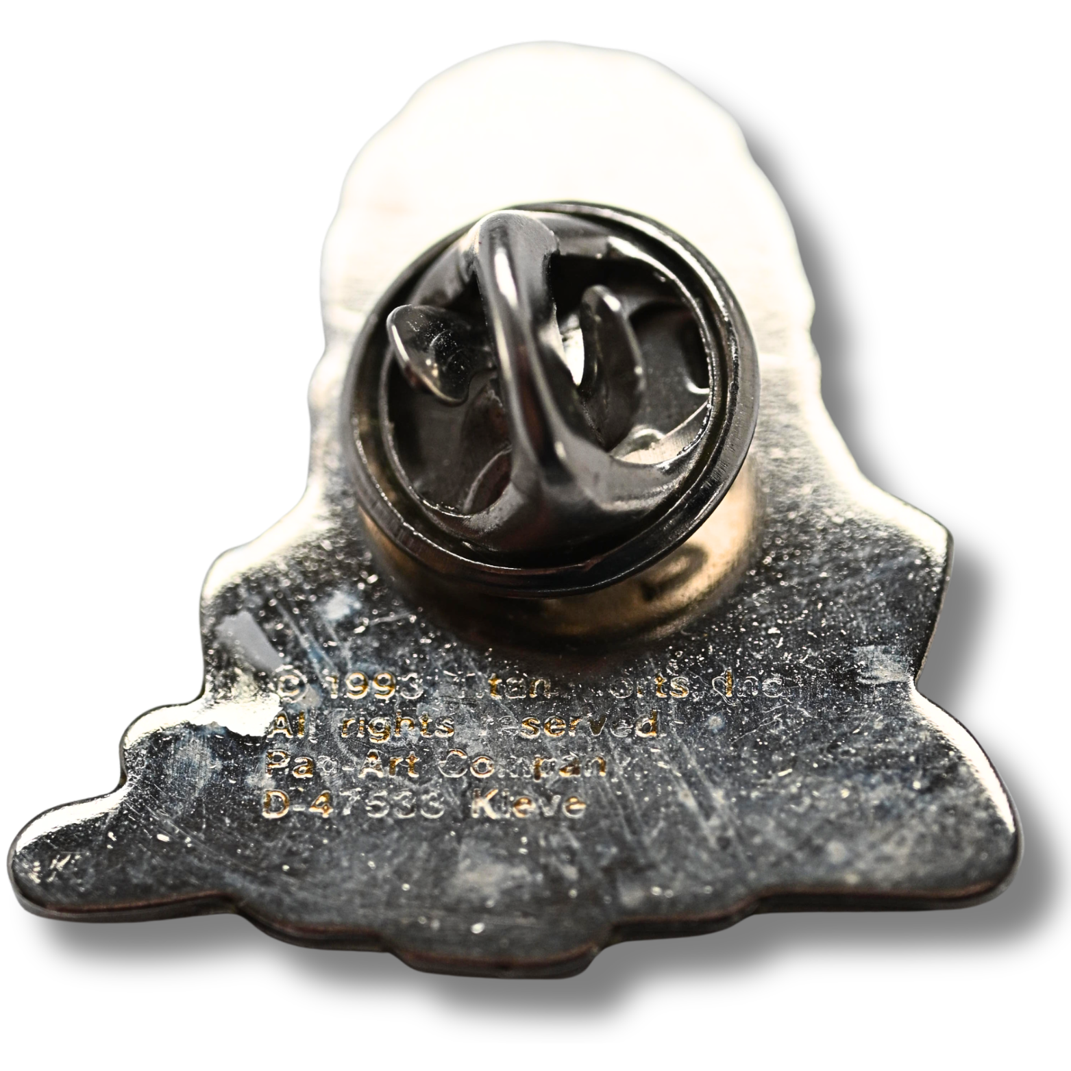 Der Pin besteht aus stabilem Metall und ist farbig emailliert. Auf der Rückseite befindet sich ein klassischer Butterfly-Verschluss, der sicheren Halt an Kleidung, Taschen, Caps oder Sammlerboards gewährleistet. Die Prägung auf der Rückseite weist auf die offizielle Lizenzierung und das Herstellungsjahr 1993 hin.