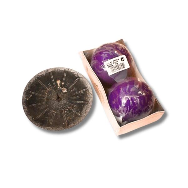 Dieses Set besteht aus zwei unbenutzten lila Kugelkerzen (Durchmesser ca. 80 mm) sowie einem dekorativen schwarzen Kerzenständer mit Dorn. Die Kerzen befinden sich noch in der Originalverpackung und sind in kräftigem Lila gehalten – ideal für stimmungsvolle Akzente in Wohnräumen oder für festliche Anlässe. Der Kerzenhalter aus Metall, mit einem Durchmesser von 12cm, weist deutliche Gebrauchsspuren und Wachsreste auf, ist jedoch stabil und funktional. Dank seiner schlichten Form eignet er sich hervorragend als Basis für die Kugelkerzen. Ein praktisches Set für alle, die eine gemütliche Atmosphäre mit einem Hauch von Farbe schaffen möchten.
